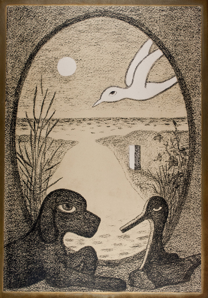 Giuseppe Viviani, Cane e gabbiani.1961Litografia a colori. mm 615x432....