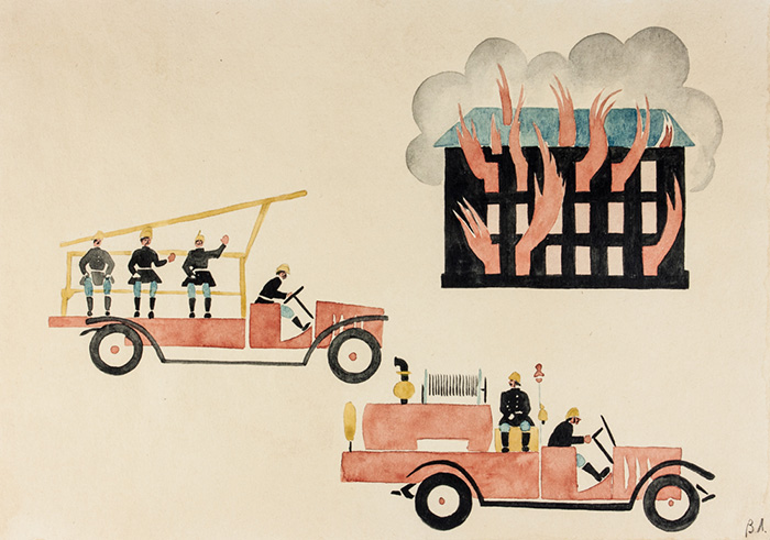 1) Costruttore. Acquerello su carta. mm 230x165. 2) Pompieri. Acquerello su carta. mm 210x300. Siglato in basso a destra a matita. (2)