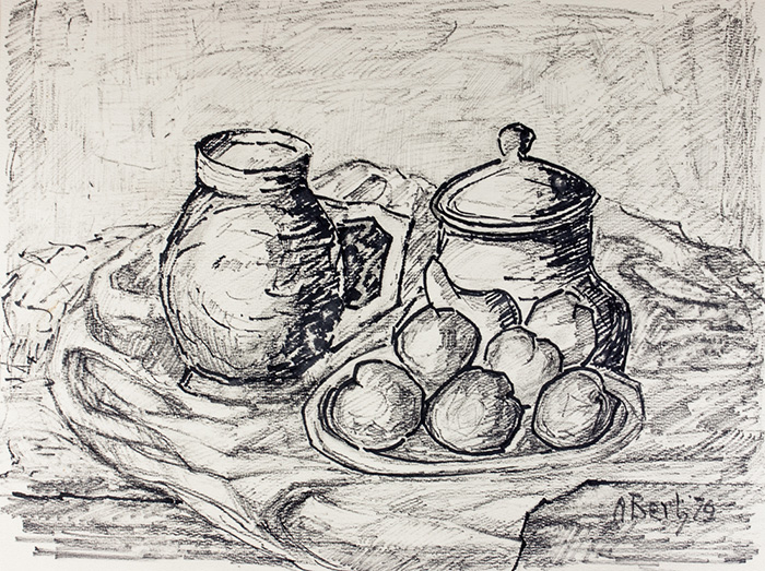 Antonio Berti, Natura morta con frutta e vasi.1979Inchiostro su carta....