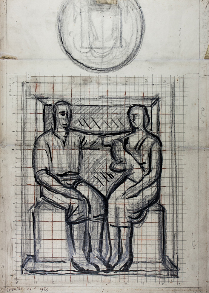 Matita e inchiostro su carta. mm 655x470. Firmato e datato e datato "Cadorin 27.V.1973 Gorizia 1932". Bozzetto per affresco eseguito e poi distrutto alle poste centrali di Gorizia, la firma e la data a destra si riferiscono a una autentica posta dall'Arista nel 1973. Corredata di foto autenticata e timbrata dalla Galleria d'Arte "Nuovo Spazio Due Venezia". Ulteriore dichiarazione di autenticità al verso.