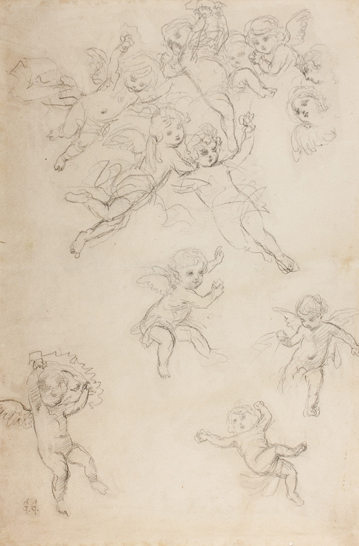 1) Generale a cavallo. Matita nera su carta. mm 285x210. Siglato in basso a sinistra. 2) Fantasia di amorini. Matita nera su carta. mm 360x240. Siglato in basso a sinistra. (2)