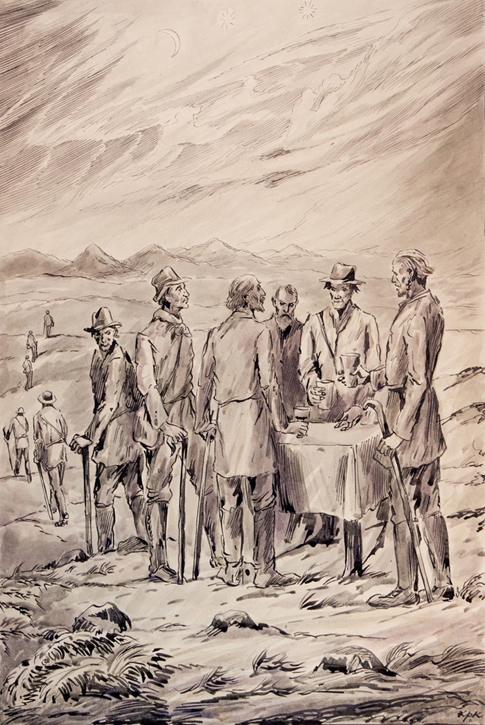 Lotto 540 | Jan Konupek, Viandanti a un tavolo. Penna e inchiostro acquerellato,. mm...