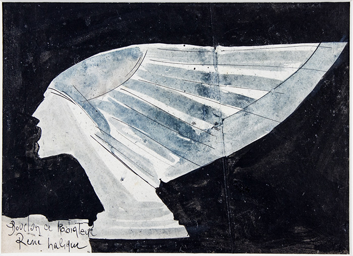 Penna, inchiostro e acquerello su carta. mm 120x167. Titolato e firmato a penna in basso a sinistra. Bozzetto per il celebre tappo in vetro per radiatore d'automobile realizzato da Lalique nel 1928.