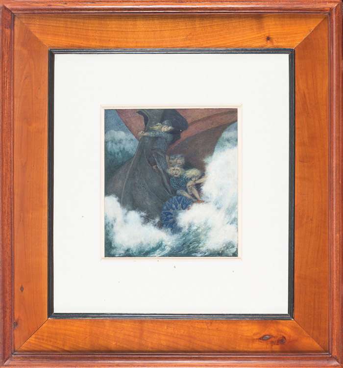Tecnica mista su cartone. mm 219x170. Monogrammato in basso a destra.. Preziosa opera originale nata dalla collaborazione di Lefler col cognato Urban. I due artisti produssero insieme decorazioni pubbliche e di scena, ma soprattutto una serie di capolavori di illustrazione di derivazione liberty e secessionista viennese, destinati a raffinatissime pubblicazioni editoriali figurate a colori per bambini ed adulti.
