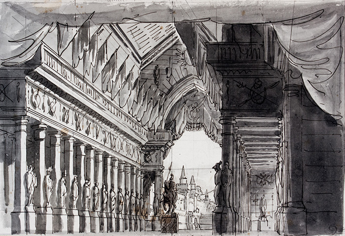 Penna e inchiostro acquerellato. mm 255x375. Formatosi nella scuola comunale di disegno, e in particolare con l’insegnamento di architettura tenuto da Pietro Tomba, fu scenografo, decoratore e vedutista. Lavorò a Pesaro, Ferrara, Ravenna, Cesena, Rimini, Urbino e Faenza. Per le decorazioni e l’architettura delle scene e dei sipari teatrali fu l’artista forse più apprezzato a livello nazionale nel periodo del melodramma. Si veda Romolo Liverani scenografo, a cura di Marcella Vitali. Faenza: Lega, 1990.