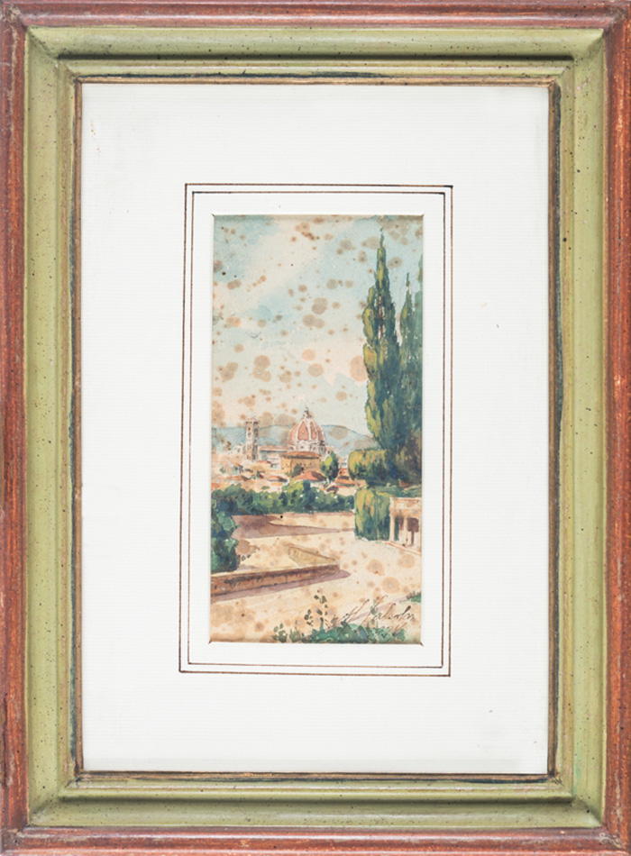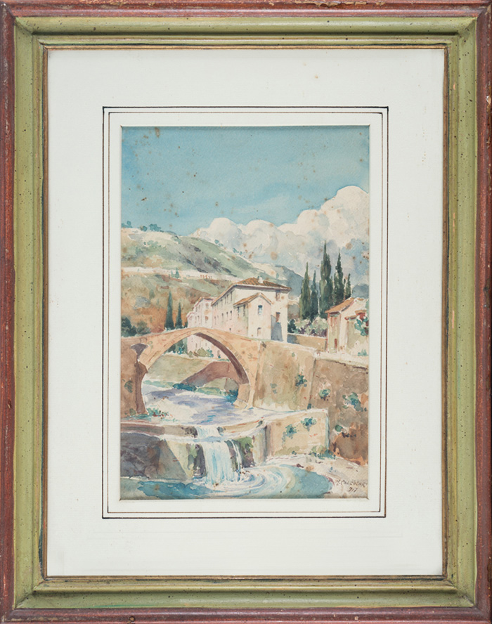 Acquerello su cartoncino. mm 260x130. Firmato a penna in basso a sinistra. SI AGGIUNGE: M. Calzolari, Ponte alla Badia. 1917. Acquerello su carta. mm 240x165. Firmato e datato a penna in basso a destra. SI AGGIUNGE: M. Calzolari, Veduta di Firenze dal Giardino di Boboli. 1927. Acquerello su carta. mm 165x85. Firmato e datato a penna in basso a destra. (3)