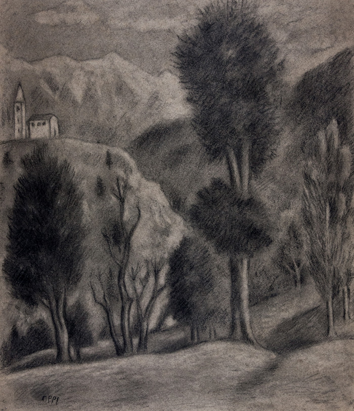 Lotto 581 | Ubaldo Oppi, Paesaggio. Carboncino su carta. mm 410x350. Firmato in...