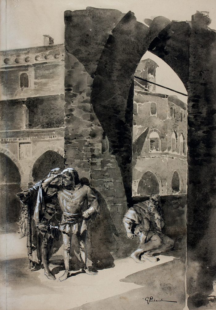Giuseppe Palanti, Scena di vita medioevale.1881 ca.Acquerello e biacca...