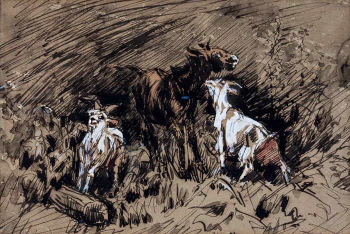 Filippo Palizzi, Cavallo e caprette. Penna, inchiostro e acquerello su...