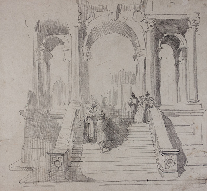 Alberto Pasini [attribuito a], Figure su una scalinata. Matita di...