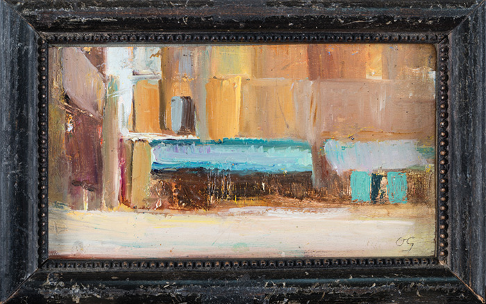 Olio su tavoletta. cm 9x15. Siglato "og" in basso a destra.
