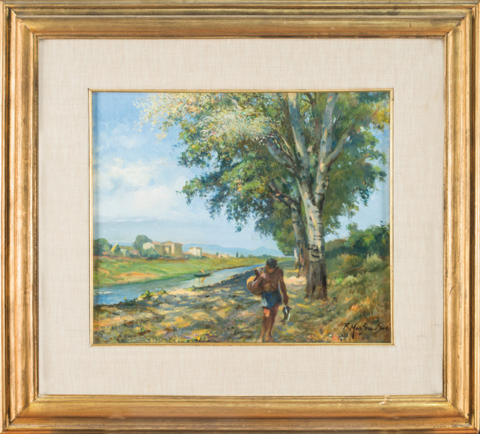 Filippo Marfori Savini, Paesaggio fluviale con pescatorello. Olio su...
