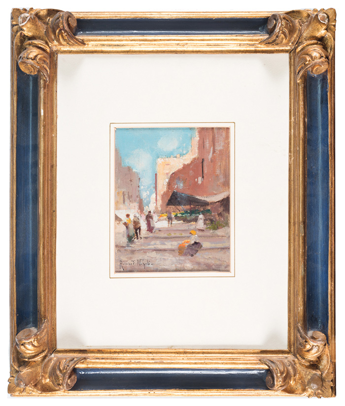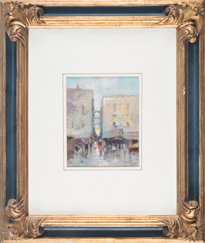 1) Strada di città. Olio su tela applicata su cartone. cm 14,5x11,5. Firmato "Ricciardi Napoli" in basso a destra. 2) Veduta di paese con figure. Olio su tela applicata su cartone. cm 14,4x11,4. Firmato "Ricciardi Napoli" in basso a sinistra. (2)