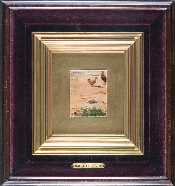 Raffaello Sorbi, Gallo e gallina. Olio su cartone. mm 80x65. Firmato in...