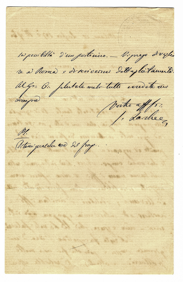 Molte lettere sono a firma di Simone Larcher e sono scritte da Milano. Tra queste carte anche un piccolo disegno su stoffa, applicato su cartoncino. Al verso è scritto: "Ricordo del Processo Lazzarettisti. Emblema della Lega degli Eremiti staccato dall'abito di un vergine facente parte dei corpi di reato [...]. Siena 4 novembre 1879". Carte da studiare.
