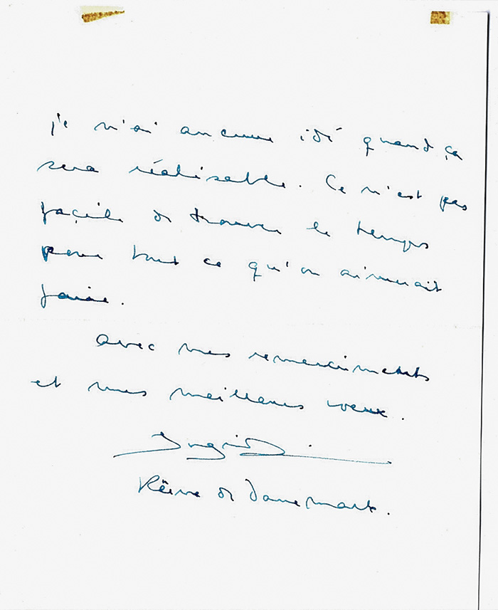 La raccolta comprende i nomi di Carlotta di Lussemburgo (2 lettere autografe, 1 biglietto e 1 ritratto della famiglia), Umberto II di Savoia, Ranieri III di Monaco (1 lettera e 1 biglietto), Pierre de Polignac - padre di Ranieri III (2 biglietti e 1 lettera), principe Ferdiando del Liechtenstein, Ingrid di Svezia (1 lettera e 1 biglietto con fotografia), principe Alex di Danimarca, duchi di Arenberg, Elena di Grecia.