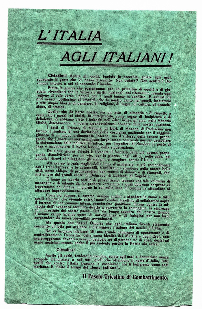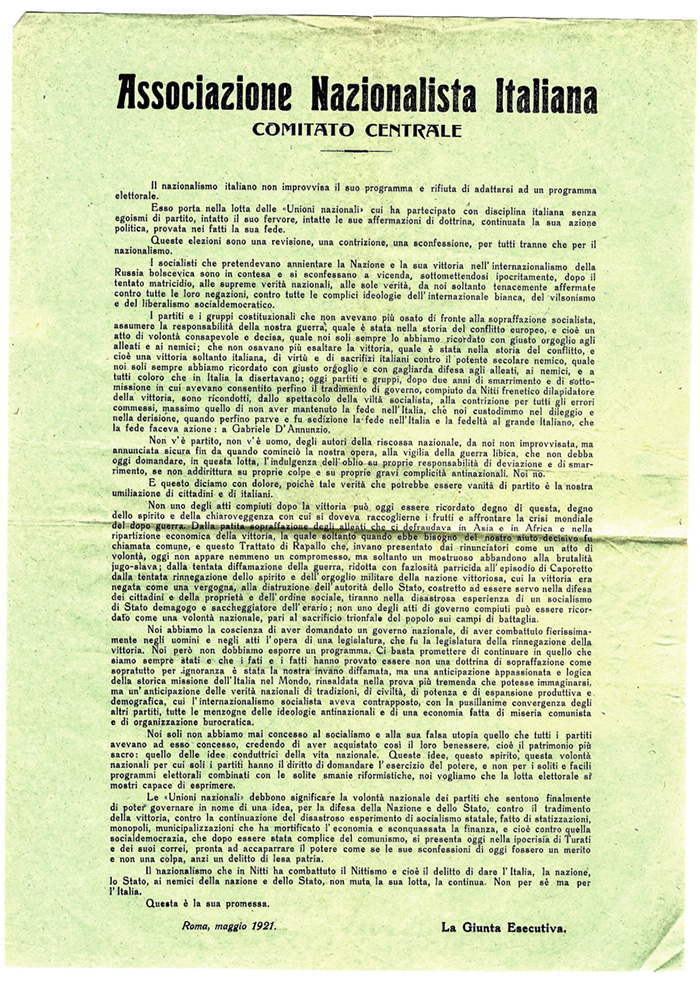 Tra i vari titoli: “Discorsi tenuti da Benito Mussolini a Bologna ed a Ferrara”, “Blocco Nazionale Triestino / I morti del Carso aspettano che i vivi compiano tutti il loro dovere”, “El canto del bloco” ecc.