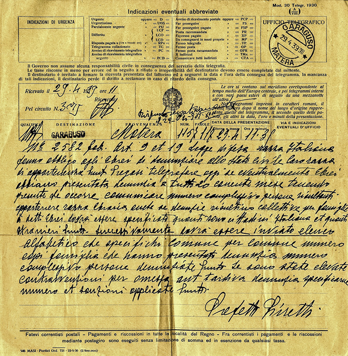 “[…] legge difesa razza italiana fanno obbligo agli Ebrei di denunziare allo stato civile loro razza di appartenenza. Pregasi telegrafare oggi se eventualmente Ebrei abbiano presentato denunzia […] occorre comunicare numero complessivo persone risultanti appartenere razza ebraica anche se denunzie risultino collettive per famiglie a detti ebrei dovrà essere specificato quanti sono cittadini italiani et quanti stranieri […] Successivamente dovrà essere inviato elenco alfabetico che specifichi comune per comune […] se sono state elevate contravvenzioni per omessa aut tardiva denunzia […]”.