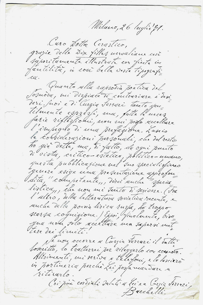 “Grazie delle Dix filles nervaliane così saporitamente illustrate con finta infantilità […]. Quanto alla rapsodia poetica del Sosnora, mi dispiace di contrariare i desideri suoi e di Curzia Ferrari […] ma fatte le necessarie riflessioni non mi posso accollare l’impegno di una prefazione […]. Questa pubblicazione […] esige una presentazione approfondita, competente, direi quasi specialistica che non mi sento di scrivere […]”.