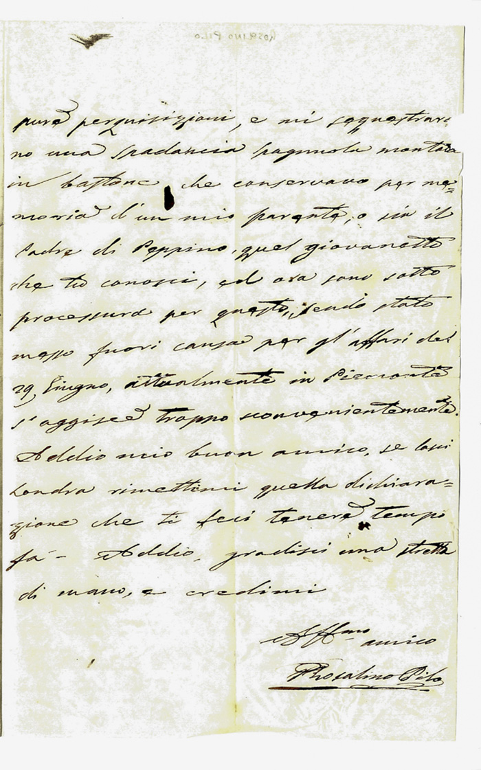 Manoscritto a inchiostro nero. 1 bifolio, scritta 1 pagina. Dimensioni: 220x140 mm. SI AGGIUNGE: Pilo Rosolino. Lettera autografa firmata inviata ad un amico. Datata 10 ottobre 1857, Malta.  (2)