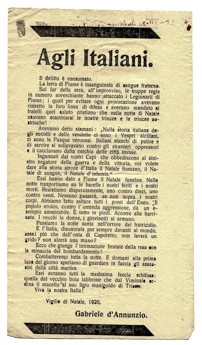 Manoscritto a inchiostro nero. 4 carte scritte al recto (2 numerate dall’autore). Dimensioni: 290x230 mm. SI AGGIUNGONO: 4 volantini a stampa a firma di Gabriele D’Annunzio, il n. 10 (25 giugno 1921) del giornale “Le lettere” relativo a D’Annunzio e altro giornale con testo di D’Annunzio.  (7)