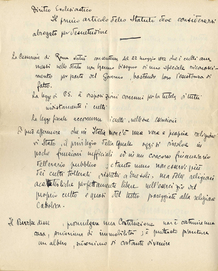 I DOCUMENTO: Carte di appunti. “La Cassazione di Roma stabilì con sentenza del 22 maggio 1892 che i culti ammessi nello Stato non hanno bisogno di uno speciale riconoscimento […]. La legge fiscale accomuna i culti nelle sue esecuzioni. […] Si può affermare che in Italia non c’è una vera e propria religione di Stato […]”.