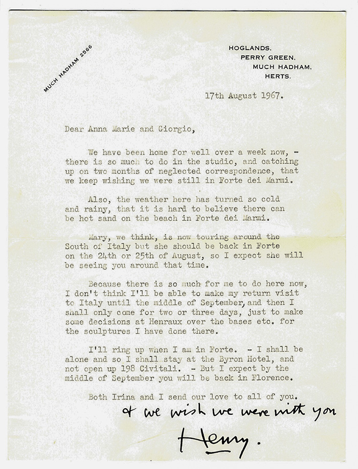Moore HenryLettera dattiloscritta con annotazione e firma autografa inviata ad Anna e Giorgio Cipriani.