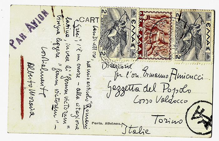 Moravia Alberto, Cartolina postale viaggiata, autografa firmata, inviata ad Ermanno Amicucci (Gazzetta del Popolo).