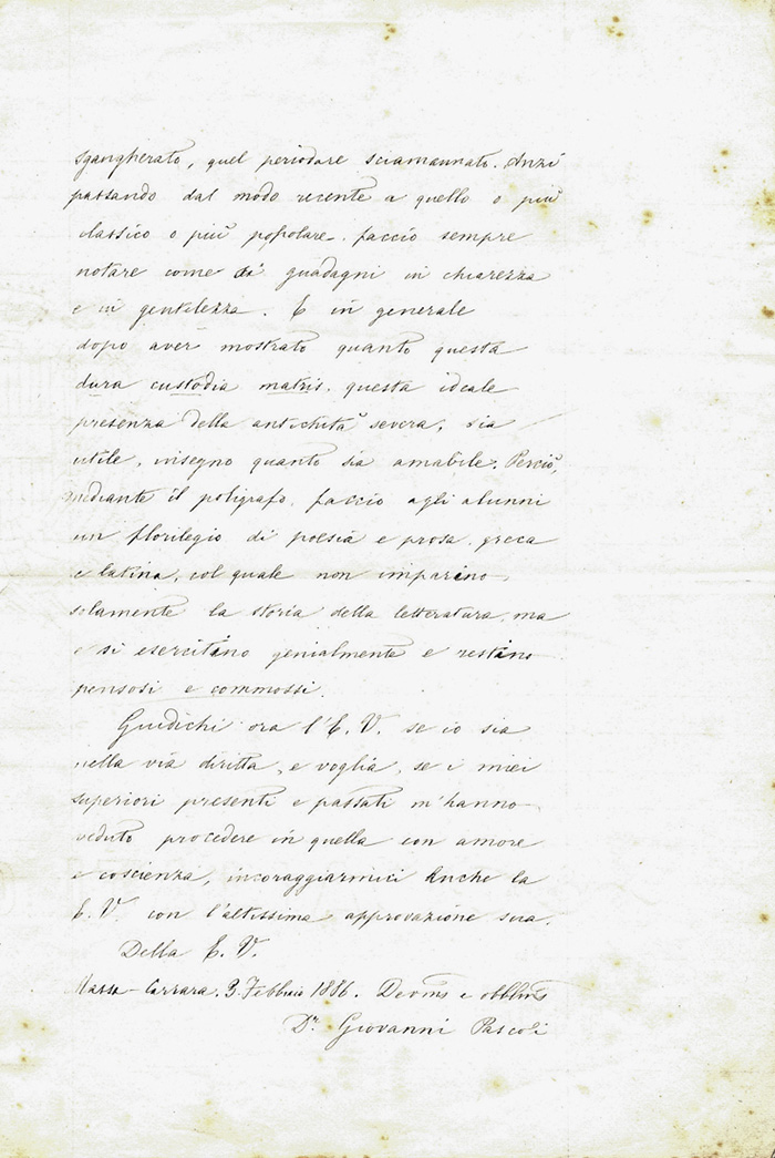 “Io sottoscritto reggente di lettere latine e greche nel 1882-83-84 a Matera, nel 1884-85-86 a Massa Carrara, chiedo d’essere promosso a titolare se alla E. V. paia che io abbia dato la capacità […] di diligenza […]. Ho sempre cercato e cerco che i miei alunni acquistino quella familiarità della lingua e dello stile latino, e aggiungo del greco, che nelle vecchie scuole era grande […] pregio. […] Interpretando non rifuggo di esporre i modi, recenti e anche barbari di dire […]”.