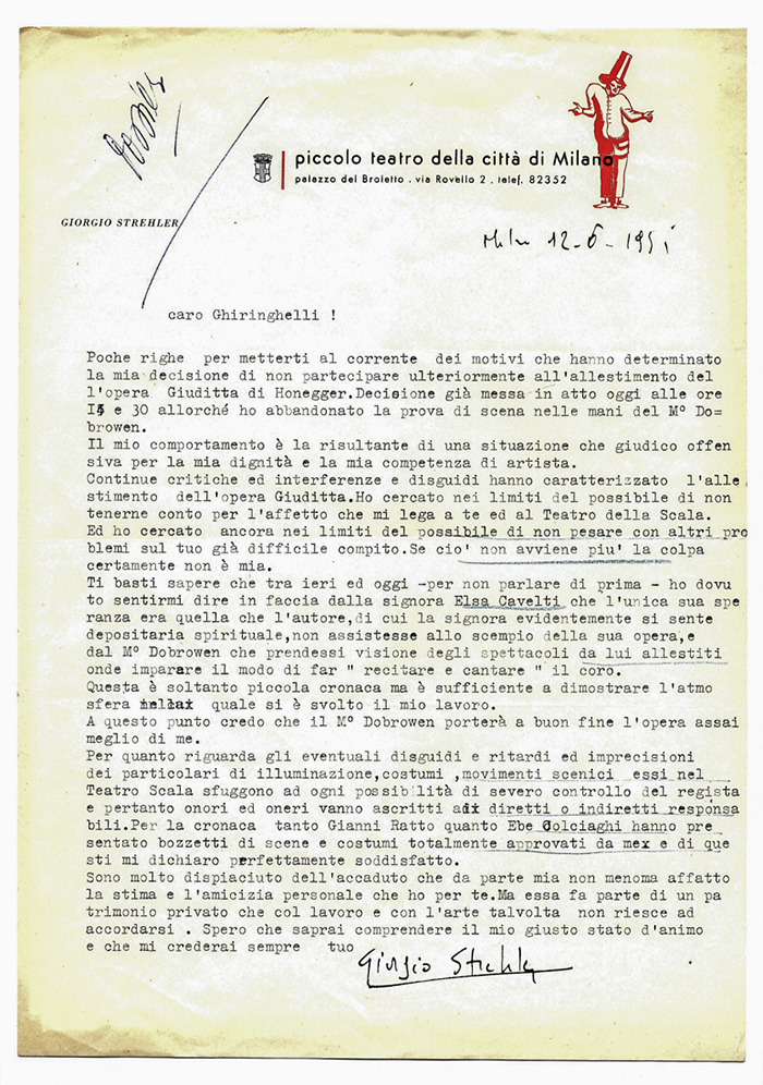"Poche righe per metterti al corrente dei motivi che hanno determinato la mia decisione di non partecipare  [...] all'allestimento dell'opera Giuditta di Honeger. Decisione già messa in atto [...] ho abbandonato la prova di scena [...]. Il mio comportamento è una risultante di una situazione che giudico offensiva. Continue critiche ed interferenze e disguidi hanno caratterizzato l'allestimento [...]. Ho cercato [...] di non tenere conto per l'affetto che mi lega a te ed al Teatro alla Scala.  Ti basti sapere che tra ieri e oggi [...] ho dovuto sentirmi dire in faccia  dalla signora Elsa Cavelti che l'unica sua speranza era quella che l'autore [...] non assistesse allo scempio della sua opera [...]".