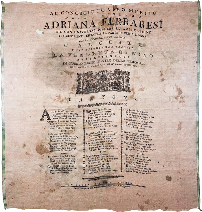 Il testo recita: "Al conosciuto vero merito della Signora Adriana Ferraresi che con universal piacere ed ammirazione gloriosamente eseguisce la parte di prima donna nella tragedia per musica l'Alceste e nel melodramma tragico La vendetta di Nino [...]". Segue canzone: "Ah di te de' merti tuoi / di cantare invan presume [....]". Firenze, 1787, nella Stamperia già Albizziana [...]". Adriana Ferraresi Del Bene (1760 ca. - dopo il 1800), soprano, fu una delle celebri amanti di Lorenzo da Ponte. Debuttò al Teatro alla Pegola nel 1784. Si esibì nei maggiori teatri d'Europa e per lei Mozart compose alcune nuove arie ne Le nozze di Figaro rappresentate a Vienna.