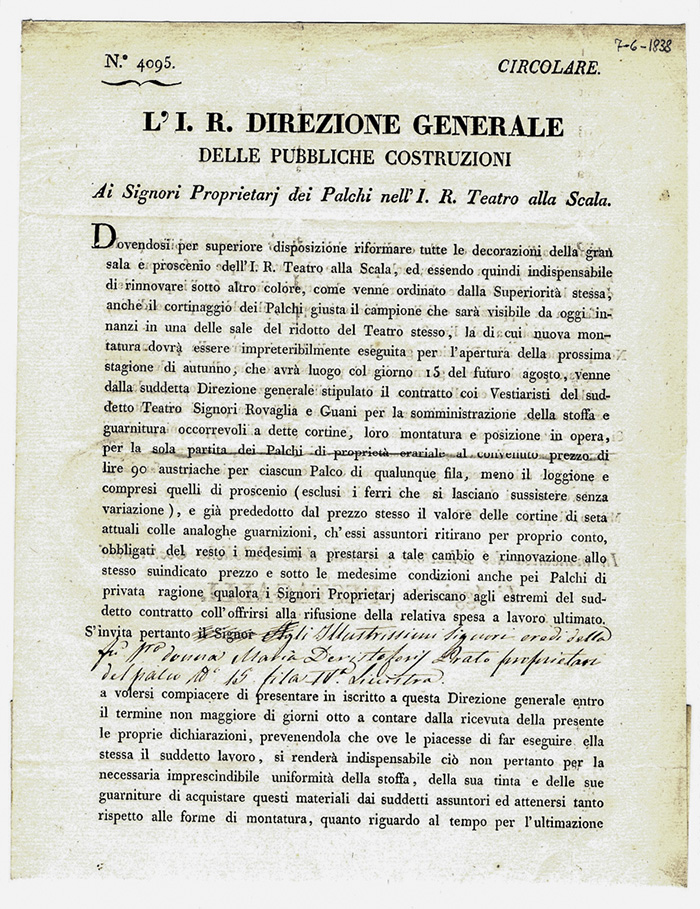 La raccolta contiene: circolari relativi ai palchi (1832-1847), programmi di sala e locandine di concerti e opere. Tra i direttori d'orchestra Franco Faccio, Giuseppe martucci, Leandro Campanari, Pietro Mascagni ecc. Nel lotto anche una brochure pubblicitaria del 12 febbraio 1893 relativa alla terza rappresentazione del Falstaff di Verdi con i nomi degli interpreti (nella brochure anche molte pubblicità, tra cui quella della Buvette Cova).