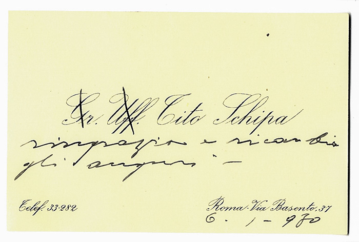I biglietti da visita hanno annotazioni autografe. La fotografia ritrare Schipa con la figlia Liana, picolissima. Il menù, con varie firme autografe, oltre a quella di Schipa, è del Ristorante Alfredo - Buca di S. Gallo, Firenze, in occasione dell'inaugurazione del Teatro Imperiale di Firenze nel 1930.