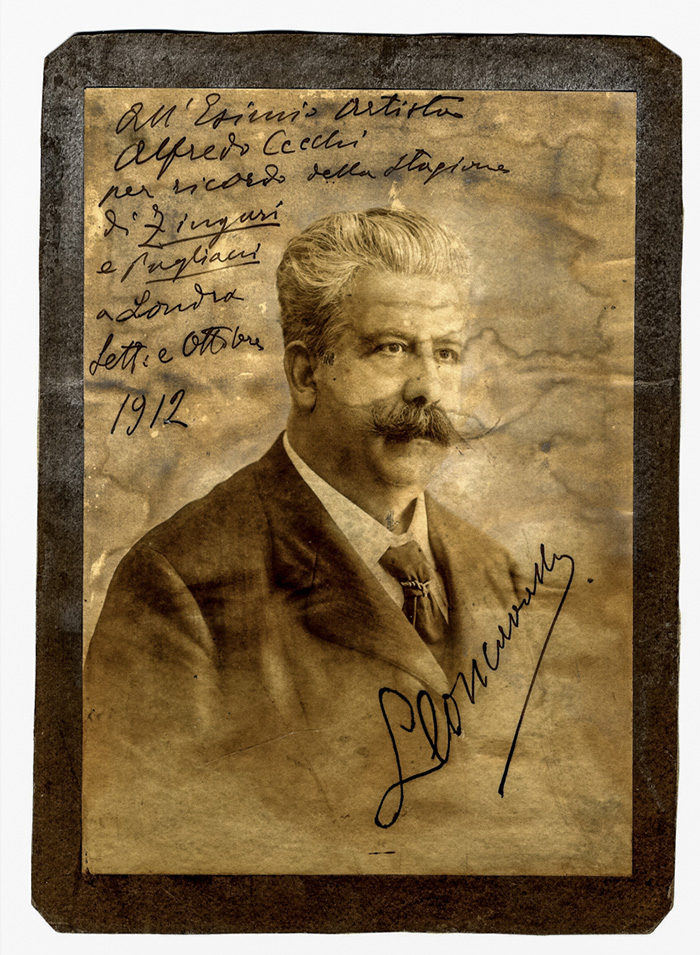 Tra i nomi: Ruggero Leoncavallo (con dedica autografa, firmata. Alcune tracce di umido), Vittorio Arimondi (il primo interprete di Pistola in Falstaff di Verdi - con dedica autografa, firmata), Mafalda Favero (Foto del Teatro alla Scala, anno XV) ecc. Varie foto del tenore Alfredo Cecchi in abiti di scena, altre immagini ritraggono concerti e rappresentazioni di opere. Altre non identificate. Anche due grandi foto di Isa Miranda (una con firma autografa) e una fotografia che ritrae Vittorio Emanuele III. Da vedere.
