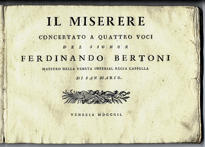 Bertoni Ferdinando, Il Miserere / Concertato a quattro voci / del Signor / Ferdinando Bertoni / Maestro nella Veneta Imperial Regia Cappella / di San Marco.