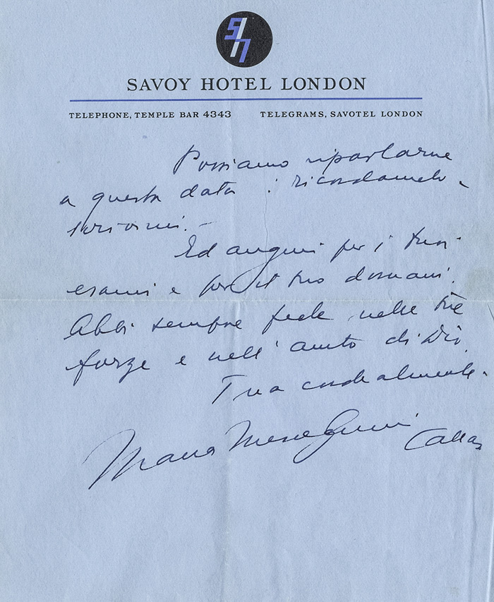 Callas Maria, Lettera manoscritta firmata 'Maria Meneghini Callas'...