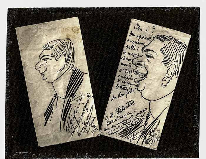 Nella prima caricatura si legge: Il figlio del / mio principale / Enrico Caruso / New York / 1913 [corretto]. L’altra è scritta in dialetto napoletano (con la rima tra “ò Re” ed “Ettore”): “Chi è? / Mo ngiò metto / o nomme / sotto! / A me, me / cham / meno ò Re! / e chiste / se chiamma Ettore! / Da New York / a D. Salvatore / De Luca / uno sconosciuto mecca / nico che tiene più al / disegno che alla / professione attuale / Enrico Caruso / New York / 14/4/913”. Curioso oggetto che ricorda l’adolescenza e gli inizi difficili del tenore. Infatti della fonderia della famiglia De Luca - all’Arenaccia – il giovanissimo Caruso lavorò come apprendista prima di diventare un celebre cantante.