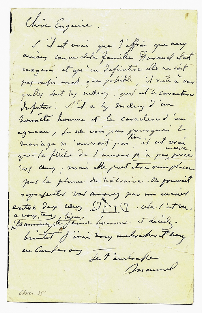 La lettera è relativa ad un matrimonio. Alla sorella scrive: "[...] si elle n'est pas aussi repoussante que vous l'aviez crue, je n'ai rien à dire contre le jeune homme. S'il n'est pas un aristo par la naissance, il l'est par l'intelligence; s'il n'a pas de fortune , les talents lui en procureront une, donc tout est bien [...]".