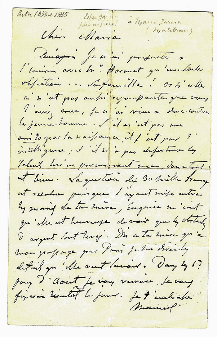 Garcia Manuel (fils), Lettera autografa firmata inviata a Maria Malibran (in parte) e alla moglie Eugénia Mayer.