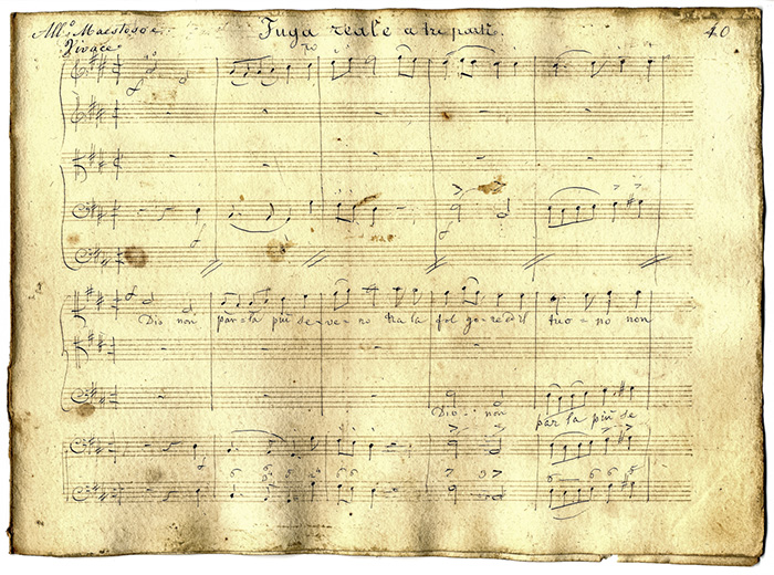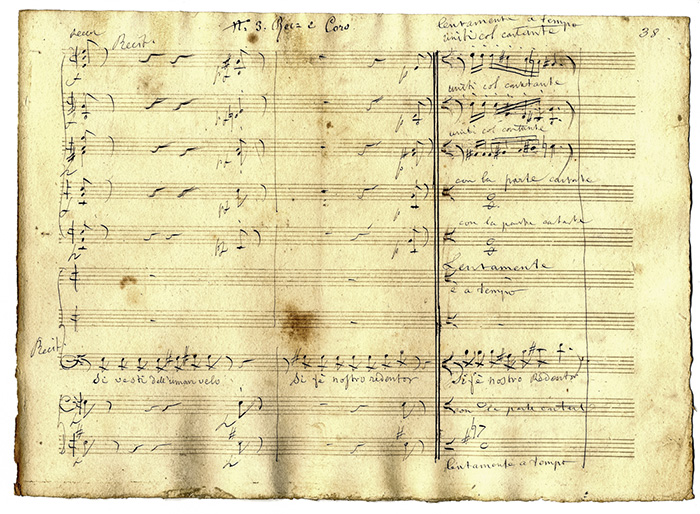 Manoscritto musicale autografo con alcune correzioni e cancellature nel testo. 116 pp. Partitura. La prima e ultima carta brunite. Le altre ben conservate, ma slegate tra loro. Il primo frontespizio è seguito da un secondo sul quale si legge: “Salmo CXVI / parafrasato in lingua italiana / dal R.mo Padre Metti di Firenze / e musicato a tre voci cioè Basso, Tenore e Soprano / per commissione / di S. E. il Sig. Duca / di San Clemente / da me Ferd. Giorgetti / 7bre del 1865 / cominciato il 2 e terminato / il 14”.