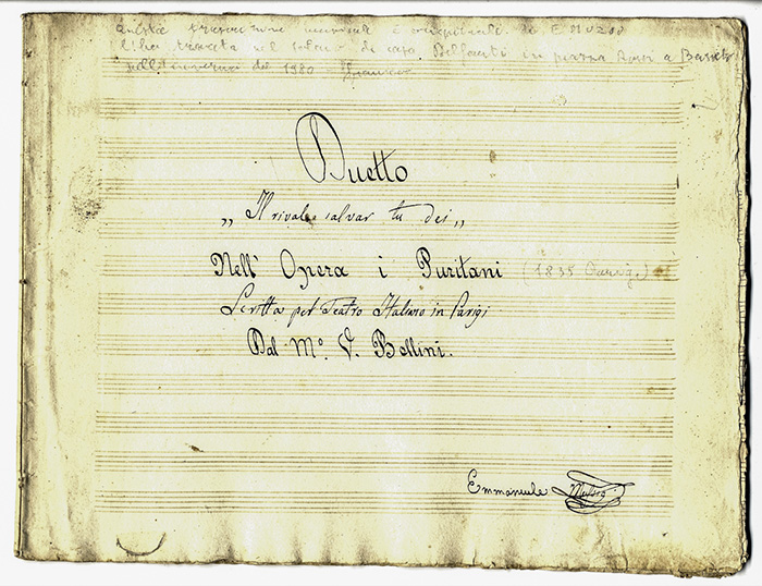 Muzio EmanueleTrascrizione autografa di Emanuele Muzio del 'Il rivale salvar tu dei' nell'Opera 'I Puritani' Scritta pel Teatro Italiano in Parigi Dal M. V. Bellini