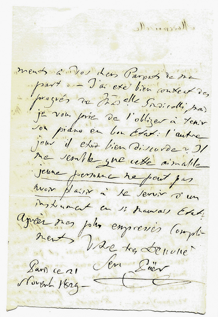 "J'espère bien de pouvoir aller jouir de vos réunion musicales, et surtout votre beau talent [...] de obliger à tenir son piano en bon état... Il me semble que cette aimable jeune personne ne peut pas avoir plaisir à se servir d'un instrument en si mauvais état [...]".