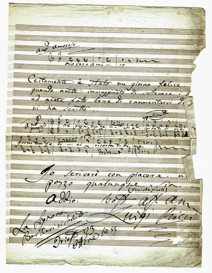 Ricci scrive questa lettera ad un amico; alcune frasi sono musicate. "Caro Amico [in musica], certamente è stato un giorno felice quando avete immaginato di sollevare [...] ed avete fatto bene di rammentarvi di chi vi ha scritto. Ne' giorni tuoi felici [citazione musicale] [...]. Io scriverò volentieri un pezzo qualunque [...]".