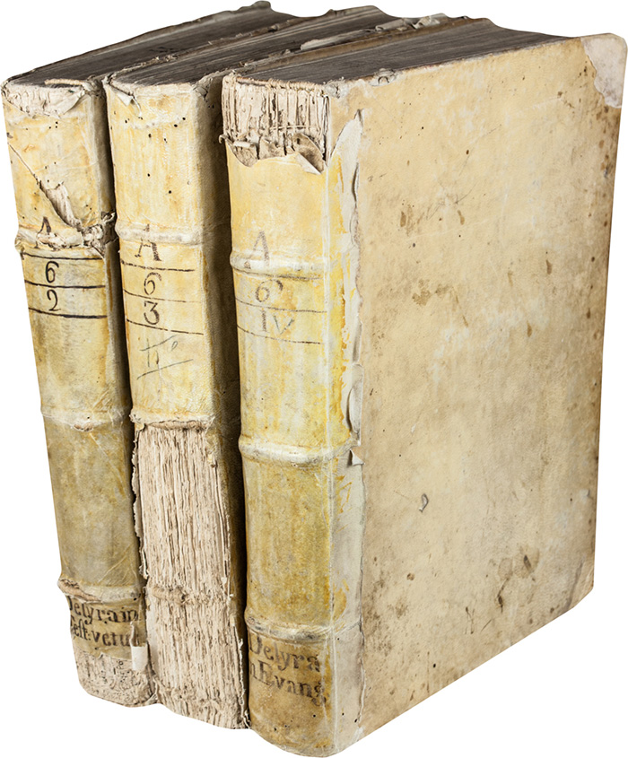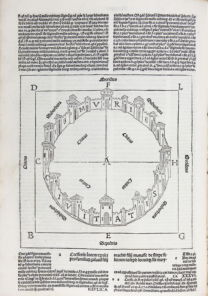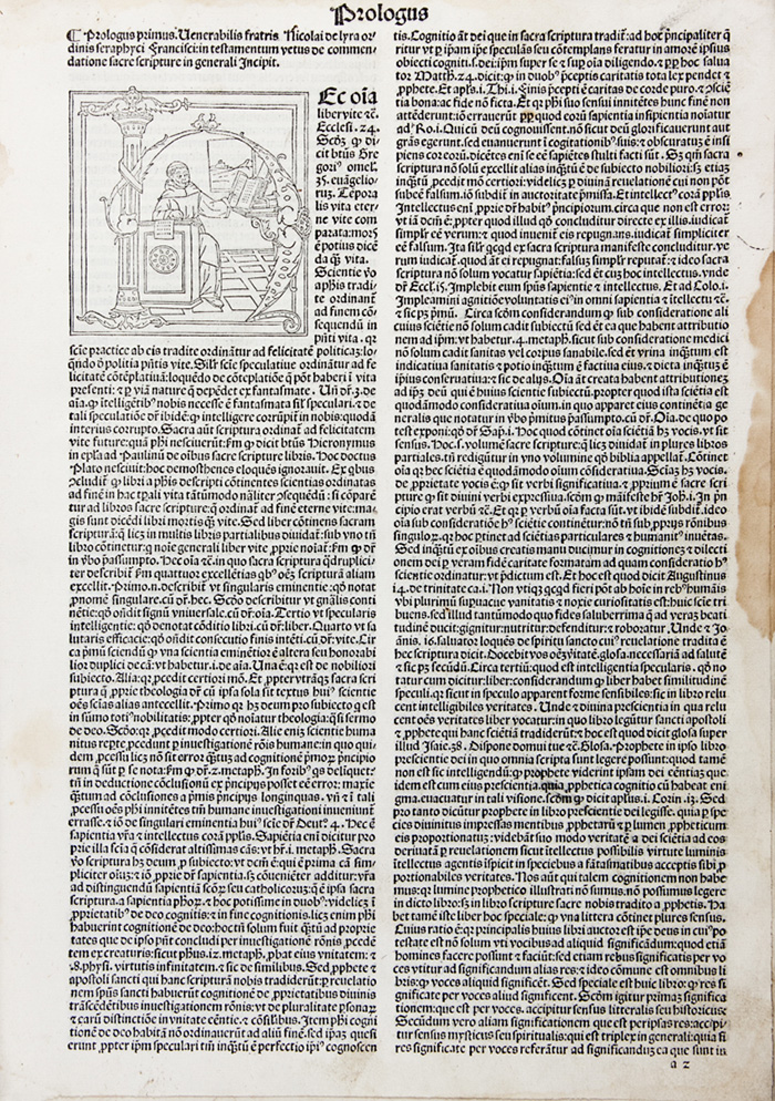 3 volumi (su 4) in-folio (mm 315x225). Volume I: Carte [299], la prima bianca. Segnatura: a10 b8 c-l10 m10+1 n-z [et] [con] [rum]10 Aa-Dd10. Volume II: Carte [291] (di 292, manca l'ultima bianca). Segnatura: aa-zz10 2[et] 2[con] 2[rum]10 Aaa-Bbb10 Ccc12 (-Ccc12). Volume IV: Carte [272]. Segnatura: A-Z [ET] [CON] [RUM]10 +12. Testo e commento in caratteri gotici (G 74. G130, G92) su due colonne e 74 linee. Con una grande iniziale incisa a carta a2r del primo volume raffigurante Nicolaus de Lyra in lettura e molte xilografie nel testo, delle quali una a piena pagina. Spazi per capilettera con letterine guida. Lievi gore d'acqua marginali nei tre volumi, forellini di tarlo lontani dal testo a pochi fascicoli del primo volume, molte carte allentate nel secondo, qualche brunitura nel terzo ma nel complesso buona copia. Legatura settecentesca in piena pergamena con dorsi rinforzati in pergamena e titoli manoscritti; lacune ai dorsi, più ampie a quello del secondo volume, e altre mende. (3)
