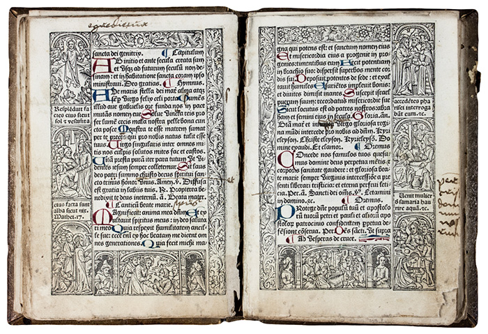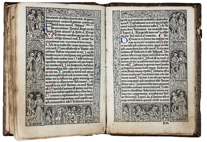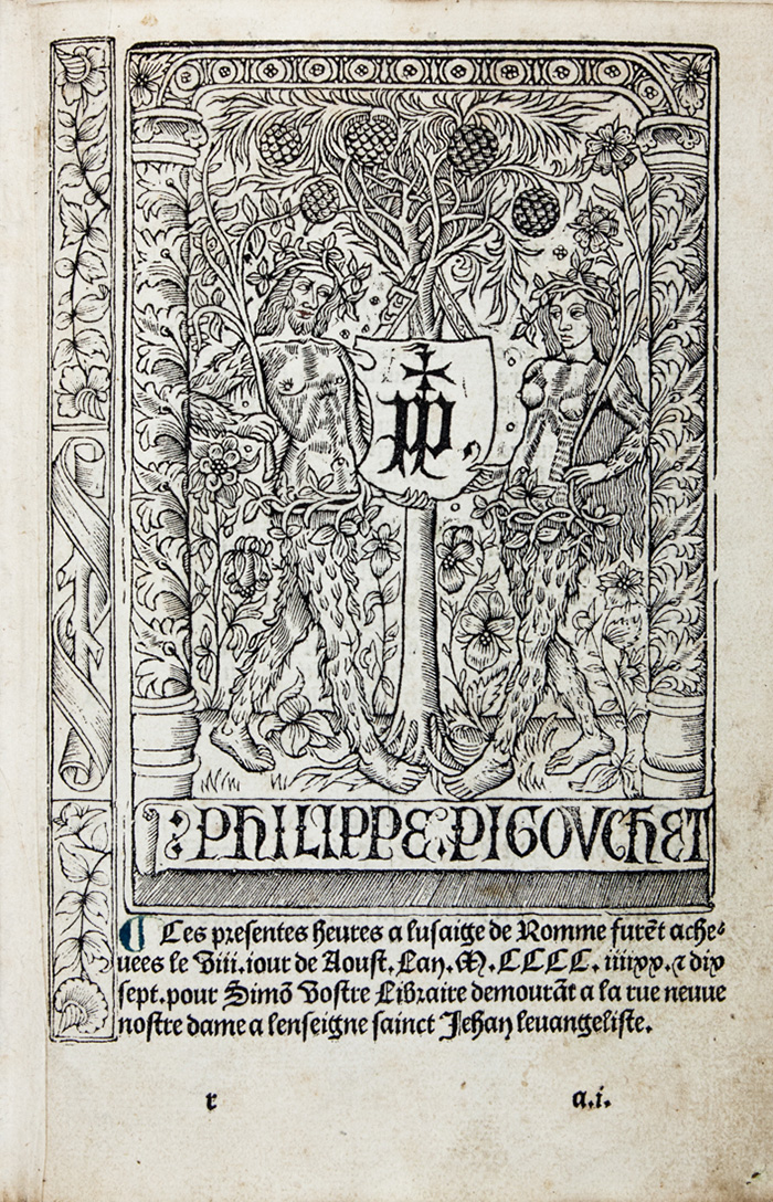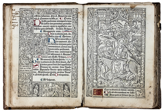 Copia imperfetta di uno splendido e non comune Libro d'Ore a stampa, profusamente illustrato. Vostre libraire d'Heures 4: «Le premier libraire qui paraisse avoir publié des Heures à gravure est Simon Vostre»; Lacombe 41-42; manca a Brunet, Heures e Bohatta. Oltre alla grande marca raffigurante Adamo ed Eva al frontespizio, sono raffigurati a piena pagina l'Uomo anatomico, il Martirio di San Giovanni, Il bacio di Giuda, l'Annunciazione, La Vergine e sant'Anna, la Natività, l'Adorazione dei Magi, la Presentazione al Tempio, la Fuga in Egitto, la Morte della Vergine, David e Betsabea e Lazzaro ed il ricco Epulone. Queste splendide incisioni appartengono alla seconda serie di illustrazioni dei Libri d'Ore del Vostre, basata su disegni del Maestro dell'Apocalisse della Sainte-Chapelle (anche detto Maestro delle Très petites heures d’Anne de Bretagne); Cfr. BMC VIII, 118: «The large and small cuts and the borders are from the same blocks as in the editions of 1496» ad eccezione di quelli che decorano le vite della Vergine e di Gesù, «in addition, there are series of border-panels with criblé ground illustrating the seven cardinal virtues...»; Fairfax Murray French 289; Reinburg 33: «Pigouchet apparently engraved these extraordinary miniatures and borders following designs created by a small network of artists and workshops, generally associated with an artist or artists styled variously as the Master of Anne de Bretagne, the Master of the Very Small Hours etc...». I Suffragia sanctorum et sanctaram sono poi ornati da 29 piccole vignette e ogni pagina di testo è inoltre incorniciata da ricche bordure istoriate e ornamentali, alcune anche su fondo nero puntinato come ad esempio la celebre serie della Danza macabra.