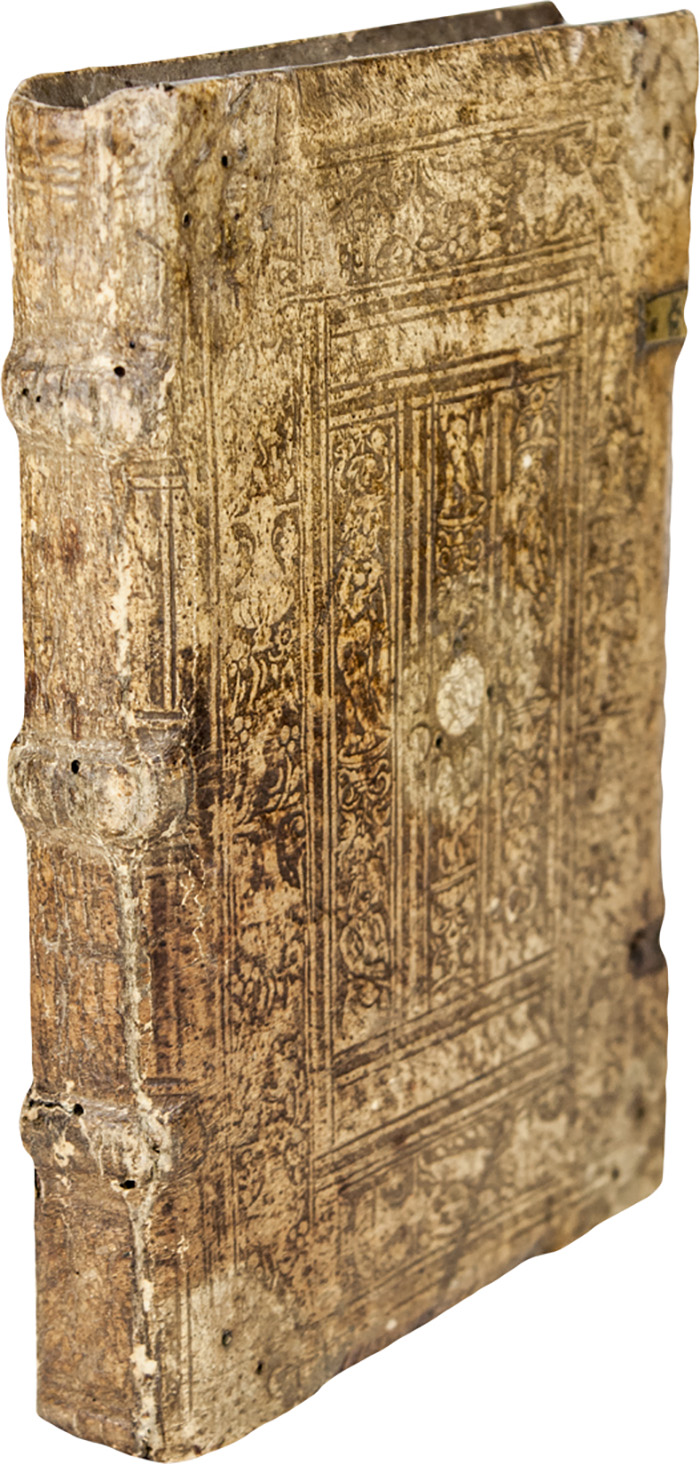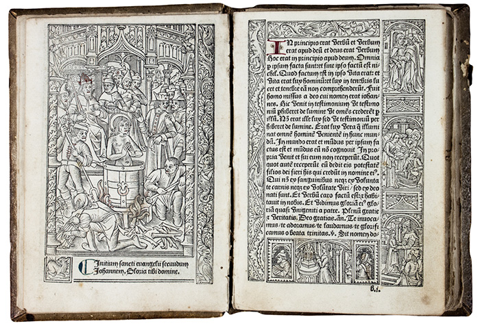 In-8° (mm 160x110). Carte [87] (di 90). Segnatura: a-k8 (-d4, d5, g1) l10. Testo in carattere gotico (G 130) su 26 linee, inquadrato in ogni pagina da ricche bordure istoriate. Ampia marca dello stampatore al frontespizio e 12 (di 14) incisioni a piena pagina nel testo, oltre a 29 piccole vignette raffiguranti i supplizi di Cristo e dei santi martiri. Interamente rubricato in rosso e in blu. Esemplare scompleto di 3 carte e con alcune conservate slegate, allentato internamente, con tagli anche riparati ad alcuni fogli e un'ampia macchia a carta f8. Legatura coeva in pelle di scrofa su assi di legno, fittamente decorata a freddo con motivi floreali e puttini, perduti i fermagli. Molte annotazioni bibliofile al contropiatto anteriore, alcune glosse di antica mano al testo, ex-libris Marcellus Schlimovich applicato a quello posteriore.