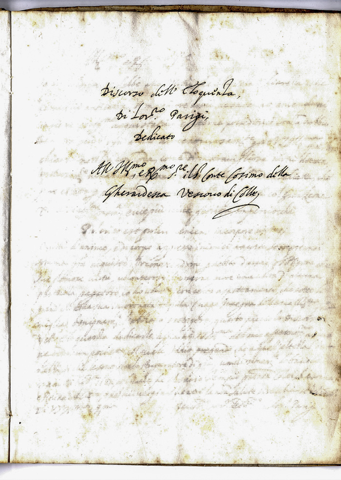 Lorenzo Parigi (Firenze 1580 ca. - 1640 ca.) fu medico alla corte medicea e autore del Dialogo [...] sopra alcune cose di medicina... (Firenze: Zanobi Pignoni, 1618). In questo manoscritto Parigi scrive: «Quantunque volte meco pensando riguardo se dannosa o giovevole sia state alla Repubbliche e alle città la scienzia del bene» e cita Omero, Cicerone, la Divina Commedia ecc. Documento inedito.