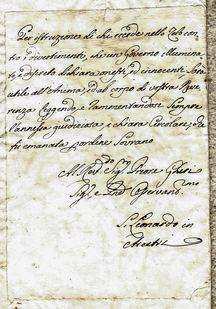 La raccolta comprende: 1 locandina a stampa della Repubblica Cisalpina relativa alla Costituzione della Repubblica (Milano, 17 fruttidoro anno VI - 1798) - «Avvertimenti» relativi a «Fiori cordiali», «Erbe emollienti», «Erbe Capillari» (manoscritto del XVIII secolo), «Circolare sopra le feste da ballo che si fanno in campagna»(20 marzo 1789 - documento a stampa con una lettera manoscritta) - Ricevuta per la paga di un musicista (1845), Sonetto «Alla nazione israelitica per aver insultato i seguaci di Cristo» (non datato, ma XIX secolo) - raccolta di 4 telegrammi su eleganti carte illustrate (inizio XX secolo).