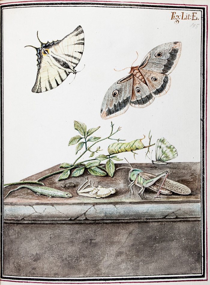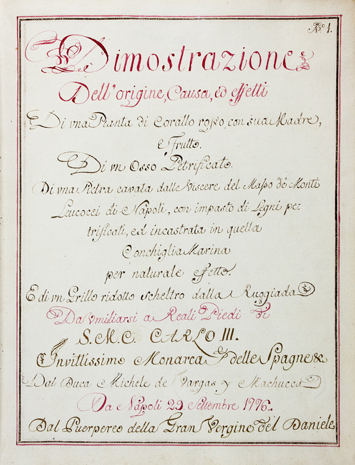 Copia di presentazione per Carlo III di questa breve ma interessante raccolta di saggi di storia naturale scritti dal duca Michele de Vargas y Machucca, e dedicata al Borbone. L'opera - ad oggi inedita - si divide in quattro capitoli, denominati fenomeni, che trattano rispettivamente dei coralli, di un osso fossile, di un «pezzo di tufo con conchiglia marina di dentro rinvenuto nei monti Leucocei» e di un grillo cristallizzato dalla rugiada. Alla fine è riprodotta un'epistola indirizzata al Vargas da Crescenzo Morelli, suo maestro e allora docente di lingue orientali a Napoli, in cui si rammarica che l'opera non sia stata data alle stampe per modestia del suo Autore e si congratula con il suo discepolo per la bontà del lavoro. Molto bella la grafia, e i 5 graziosi acquerelli che illustrano i fenomeni osservati dal Vargas, prolifico autore di Storia antica e moderna e di Diritto.