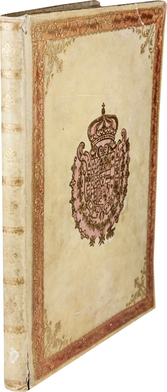 Manoscritto cartaceo in-4° (mm 265x203). Pagine 91, [1] con 5 graziosi acquerelli rilegati in fine. Testo in inchiostro bruno, rosso e dorato, ciascuna pagina incorniciata da una cornice di duplice filetto, nero e rosso. Legatura coeva in piena pergamena alle armi di Carlo III, con elaborata cornice floreale stampata in oro e ripassata in rosso e grande stemma dorato su pergamena applicato ai piatti. Un piccolo difetto alla cerniera anteriore ma buona conservazione.